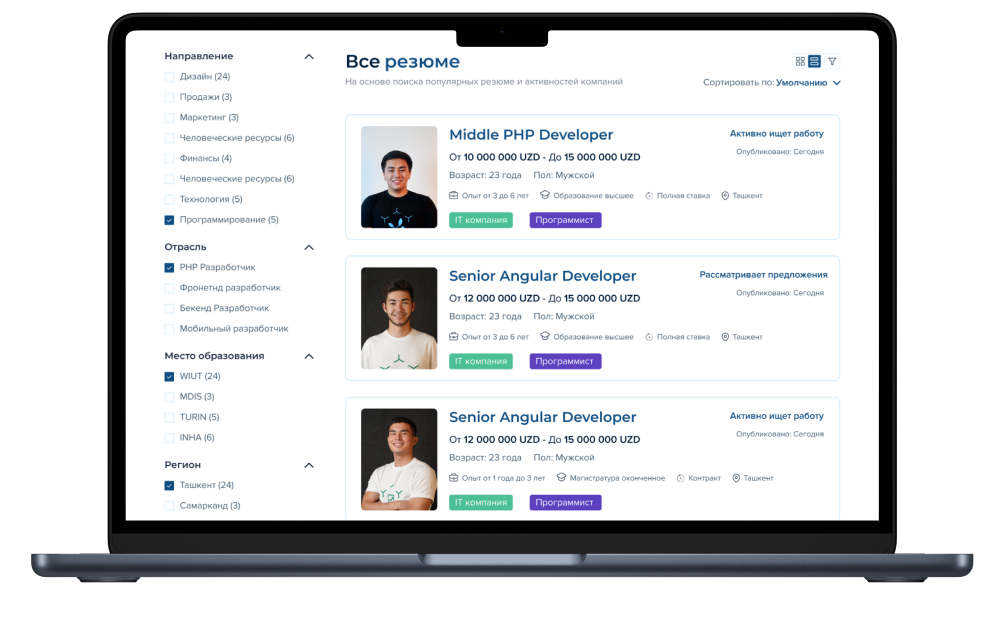 Bizning platformamiz sizga kerakli ish yoki ideal nomzodni tezda topishga yordam beradigan intuitiv vositalarni taqdim etadi. Sizni maqsadingizdan uch qadam ajratib turibdi: